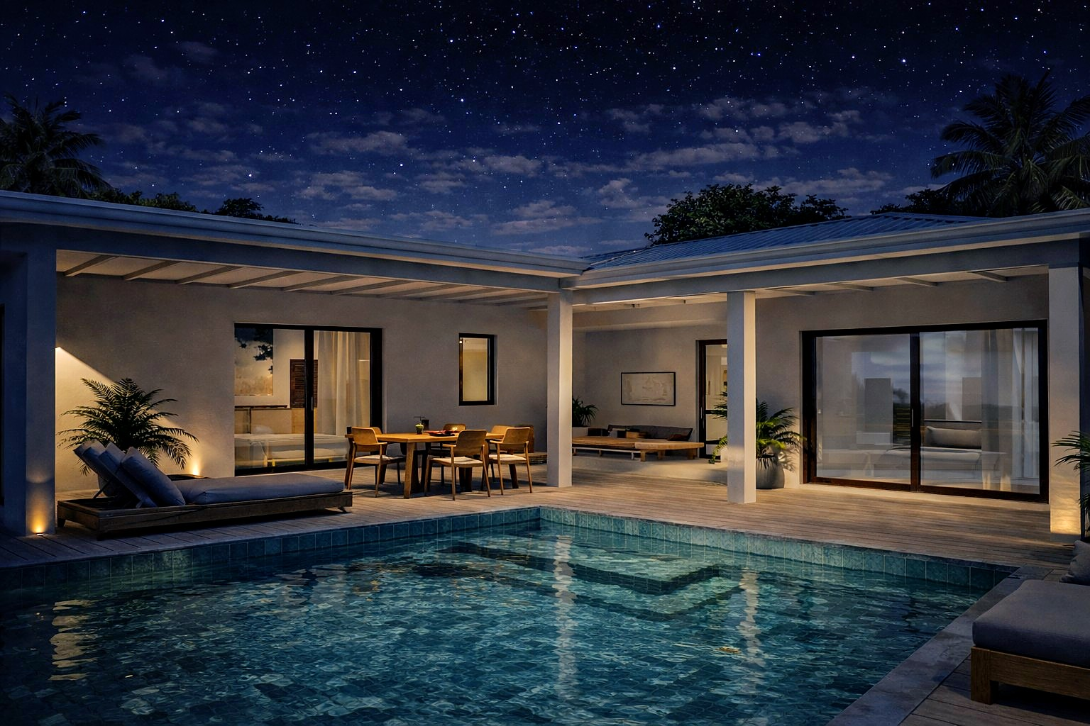Les espaces s’organisent naturellement autour de la terrasse et de la piscine, créant un lieu de vie structuré et agréable au quotidien.